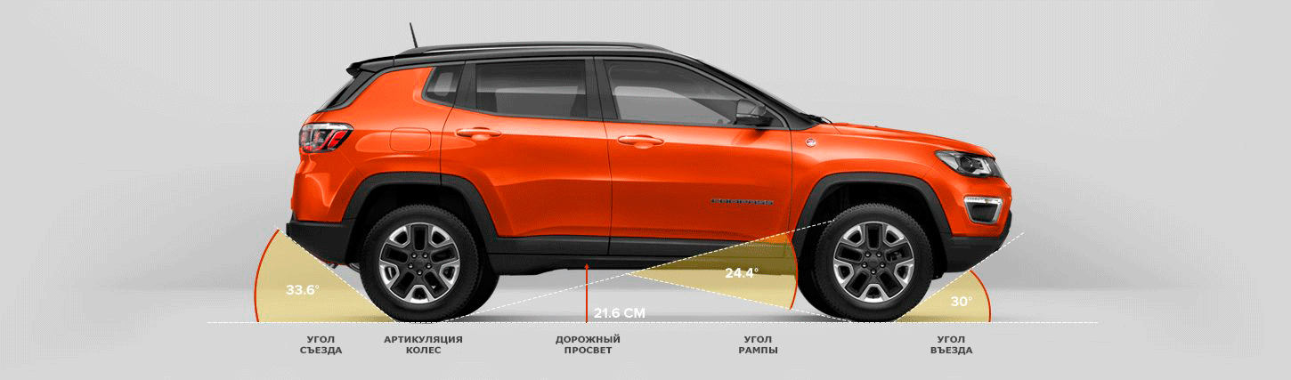 Jeep Compass Trailhawk® имеет лучшие в своем классе значения дорожного просвета (21,6 см), угла въезда (30,0 градусов), угла съезда (33,6 градуса) и продольной проходимости (24,4 градуса).